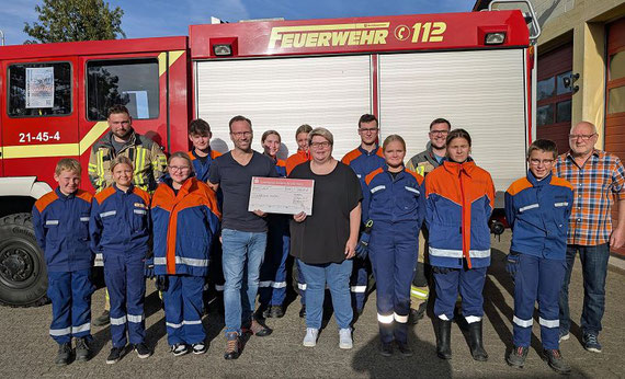 Mitte, Benjamin Waßmann und Frauke Kaliner (WZW) mit Scheck, hinten links Lukas Krause, Jugendleiter, rechts Willi Ehrhardt (WZW) und aktive Jugend-feuerwehrleute (Foto: WZW)
